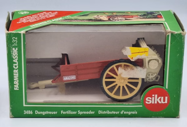 Mooie en gedetailleerde Amazone Meststrooier van Siku. Let op: wiel is licht verkleurd, model is verder nieuw, doos heeft lichte opslag schade.