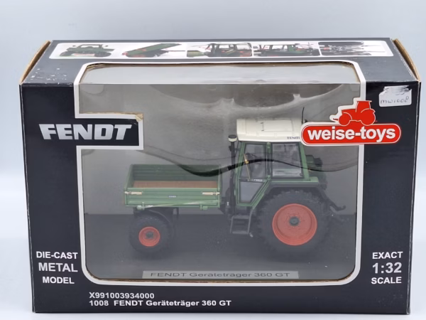 Mooie en gedetailleerde Fendt 360 GT Werktuigendrager van Weise Toys. Details zijn o.a..: bak kan kiepen, ramen en deuren kunnen open, klep van de bak kan open en hefinrichting. Let op: doos heeft lichte opslag schade, model is in nieuw staat.