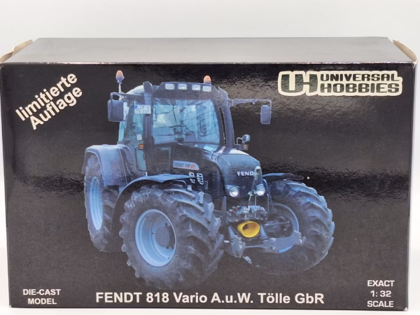 Mooie en gedetailleerde Fendt 818 Vario A.u.W. Tolle GbR Limited Edition van Universal Hobbies. De details zijn o.a.: speciale kleur donker zwart, 4WD, fronthef, achterhef, zwaailampen en werklampen. Model is in nieuwstaat.