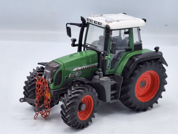 Mooie en gedetailleerde Fendt 818 Vario van Universal Hobbies. De details zijn o.a.: achterhef, zwaailamp, werklampen en cabine interieur. Let op: model is voorzien van luchthoorns, sleepketting en frontblok is verwijderd. Schade: topstang achter bovenste stukje afgebroken. Model is zonder doos, verder in nieuwstaat.
