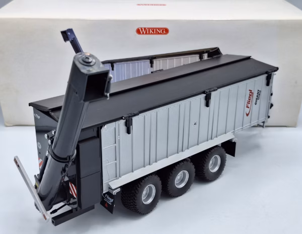 Mooie en gedetailleerde Fliegl Gigant Afschuifwagen met Overlaad Vijzel van Wiking. Details zijn o.a..: 3assen, vijzel kan uitklappen, afdekkleppen, afschuifsysteem, aftakas en steunpoot. Model is in nieuwstaat.