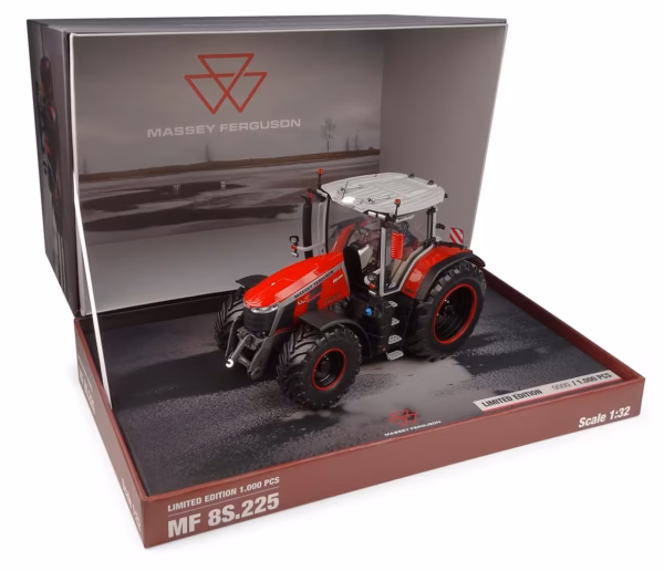 Mooie en gedetailleerde Massey Ferguson 8S.225 Loonbedrijf Beute Roodkapje Limited Edition van Universal Hobbies. De details zijn o.a.: fronthef, achterhef, luchthoorns, antennes, zwaailampen en rode rand op velg.